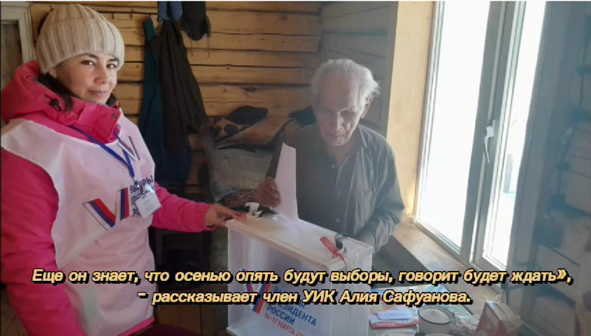 Член УИК Алия Сафуанова рассказывает, как они добрались до избирателя: «Доехали на снегоходах, туда дороги то нет. Встретил он нас хорошо, поблагодарил, что его поддерживаем. Сказал, что проголосовал за тех, кто поддерживает нашу страну, чтобы в России все было хорошо. Еще он знает, что осенью опять будут выборы, говорит будет ждать».