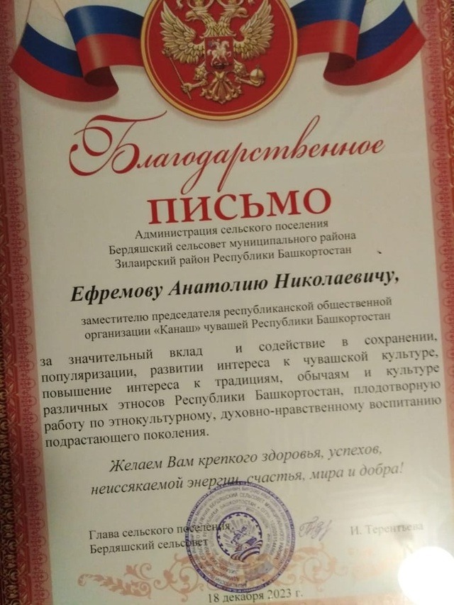 Стоит отметить, что нашему земляку врученоно благодарственное письмо от администрации СП Бердяшский сельсовет за вклад и содействие в сохранении и популяризации, развитии интереса к чувашской культуре, а также за повышение интереса к культуре, традициям различных этносов Республики Башкортостан.